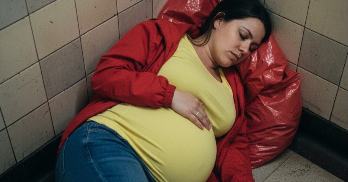 No chão sujo, jazia uma mulher encolhida, envergando um blusão rasgado. Era óbvio que estava grávida, e o seu cabelo estava emaranhado e sujo.