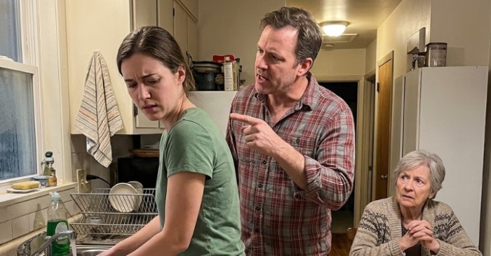 O marido e a mãe estavam sentados em silêncio à mesa. Ambos usavam camisolas quentes e pratos de comida quente estavam à sua frente. Conversavam e riam como se o ambiente da casa fosse perfeito.