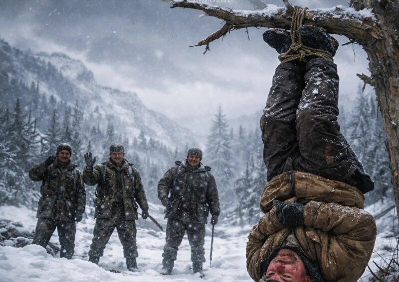 Atiraram a corda para cima de um galho grosso, puxaram-no de cabeça para baixo e apertaram os nós com força. O sangue subiu-lhe imediatamente à cabeça e a sua visão começou a ficar turva. “Divirtam-se. Amanhã voltaremos para vos buscar os ossos”, disseram em despedida e, rindo, partiram.