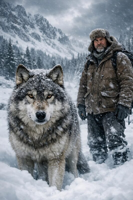 O predador parou primeiro à distância e observou-o atentamente. Assim, deu um passo. E outro. A neve estalava suavemente sob as suas patas. Os olhos cor de âmbar não se desviaram do homem.