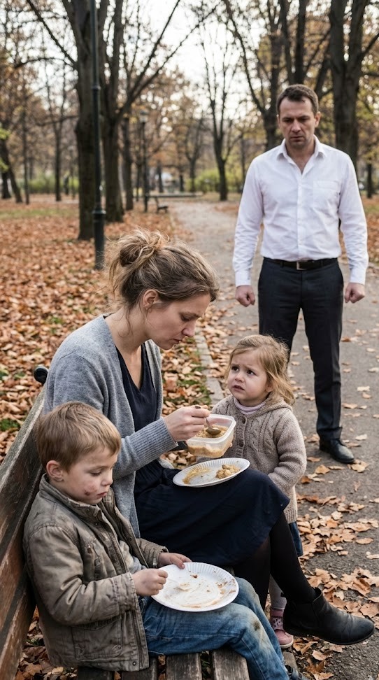 Uma jovem estava sentada, inclinada para a frente, segurando um recipiente de plástico com comida ao colo. Duas crianças estavam sentadas perto dela, uma de cada lado. Os seus casacos eram finos, mas limpos. Os seus sapatos estavam gastos. Exibiam um cansaço no rosto que não era comum nas crianças.