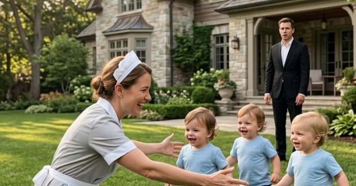Numa tarde, Alejandro regressou mais cedo a casa porque a sua reunião foi cancelada. Ao caminhar pelo corredor de mármore, ouviu um som que o fez parar — uma gargalhada verdadeira, alta e cheia de vida. Aproximou-se da enorme janela com vista para o jardim e o seu coração bateu mais forte. Mateo, Leo e Diego corriam descalços pela relva, fugindo de Carmen, que fingia ser um monstro de cócegas. As crianças lançavam-se nos seus braços com total confiança. Alejandro sentiu um aperto na garganta. Há dois anos que não via os seus filhos tão felizes. No entanto, o seu orgulho e a sua frieza em relação ao “profissionalismo” venceram. Abriu a porta com força.