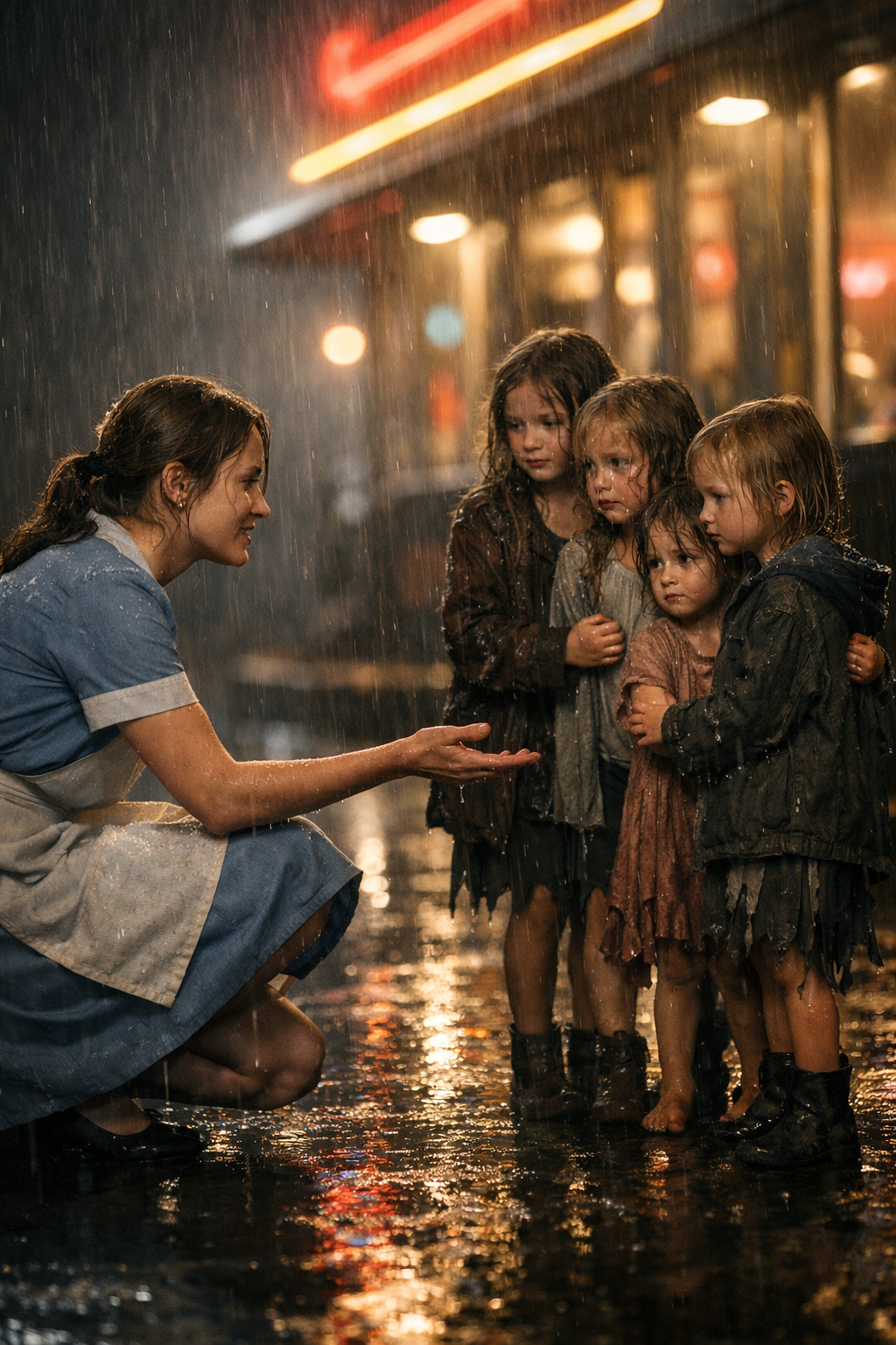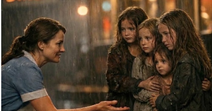 Numa noite de tempestade, numa pequena e pacata cidade, a jovem empregada de mesa Emily Parker reparou em quatro raparigas encolhidas junto à janela do seu bar. As suas roupas estavam rasgadas, os seus rostos pálidos de frio, e o peso silencioso da fome e da solidão era evidente nos seus olhos. O coração de Emily apertou de dor. Estas crianças não tinham ninguém — nem pais, nem abrigo, nem um lugar quente à sua espera.
