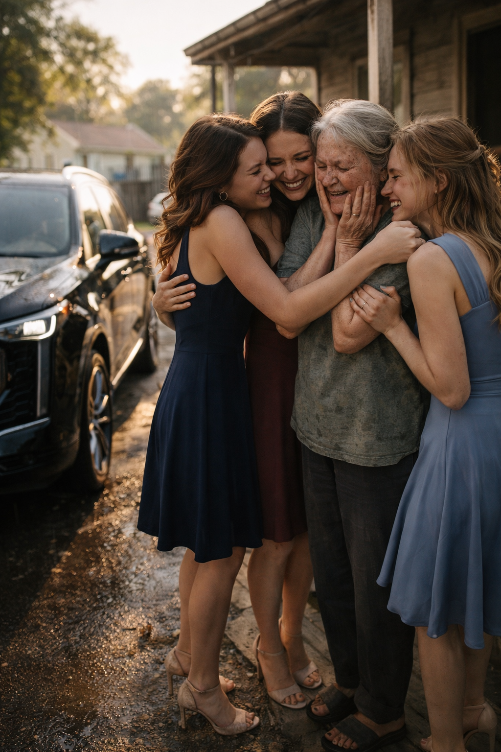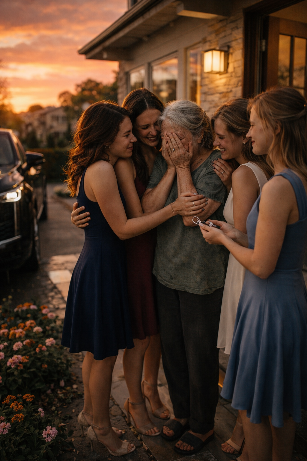 A outra tirou uma pequena chave prateada da mala e colocou-a delicadamente na mão trémula de Emily. A mulher, confusa, olhou primeiro para a chave e depois para ela. Uma das raparigas sorriu e apontou para o SUV.