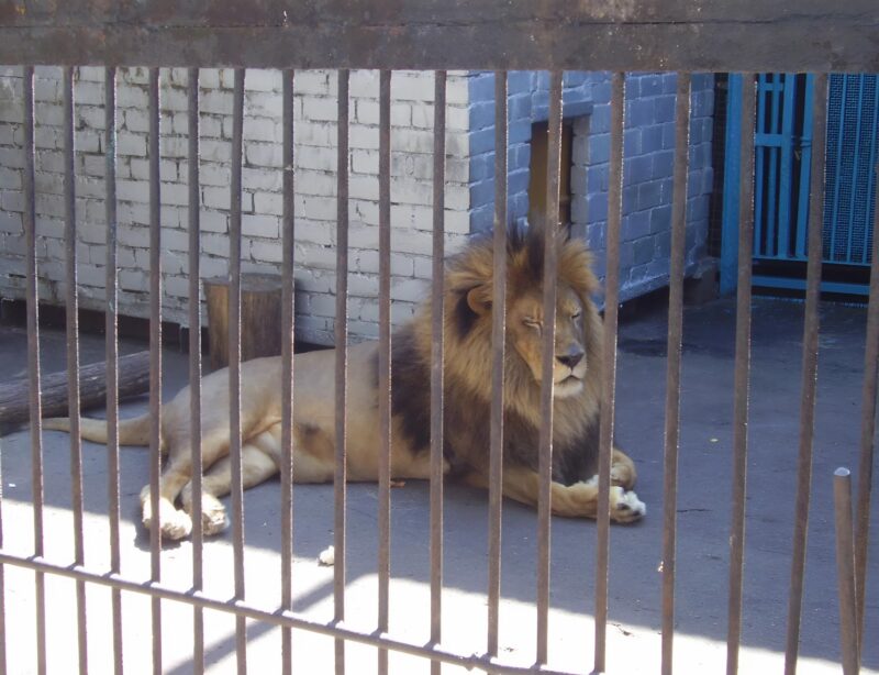 Quatro enormes leões estavam sentados atrás de grandes grades. Os seus olhos brilhavam à luz fraca do poste. Ossos e pedaços frescos de carne jaziam no chão.